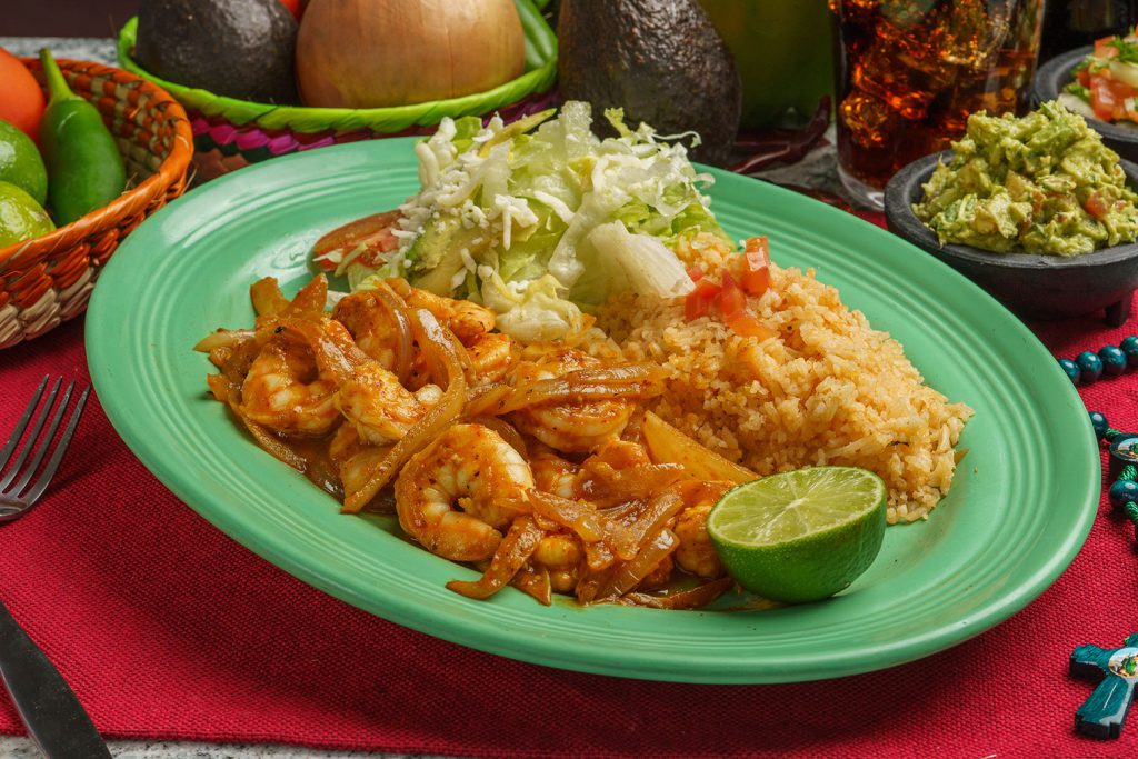 12 shrimps cooked in chipotle sauce served with a side of rice or beans and guacamole salad.