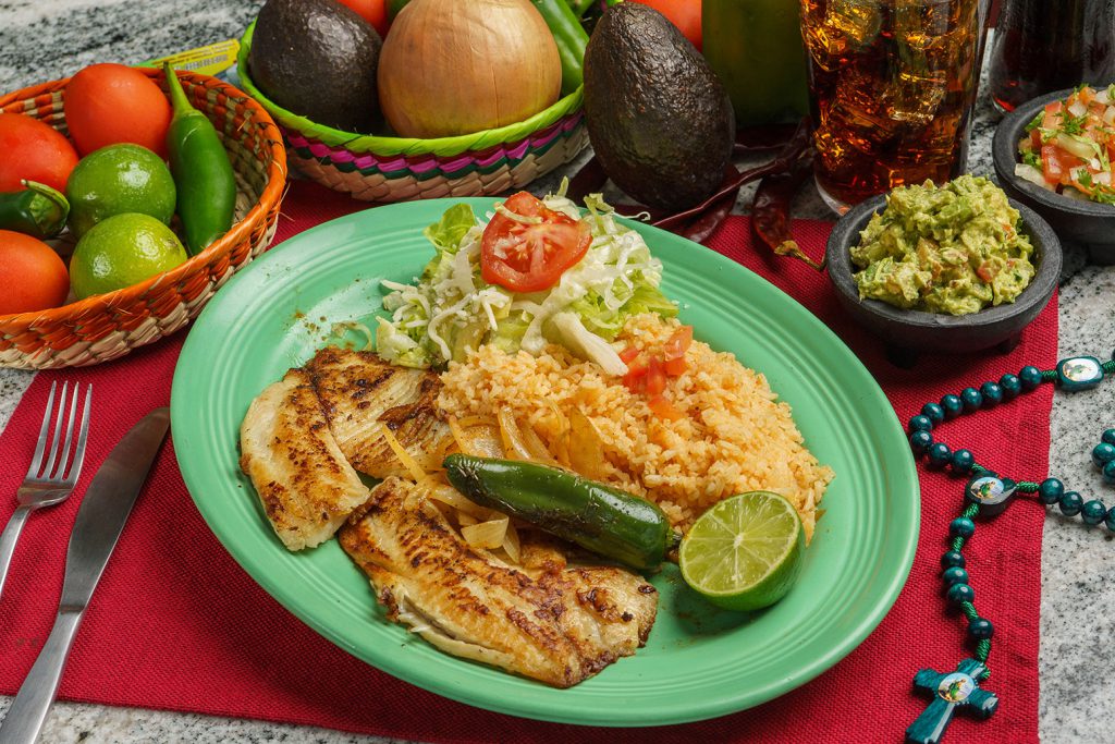 Fried tilapia served with rice, beans and salad.